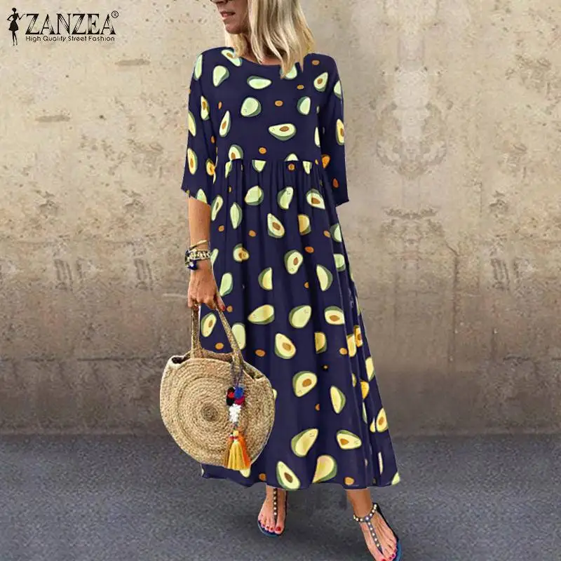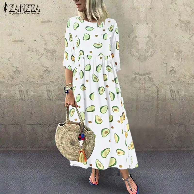 Product Name: Damskie Sundress czeski awokado długa sukienka z nadrukiem ZANZEA 2019 na co dzień 3 4 z długim rękawem Maxi Vestidos kobiet plisowana szata Plus Size