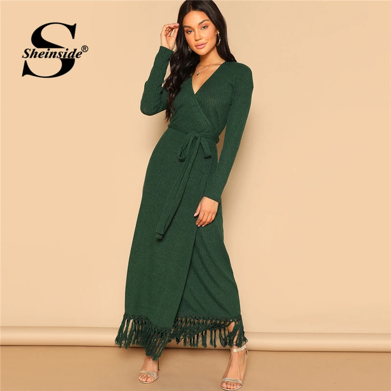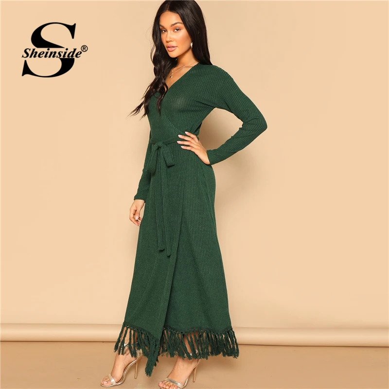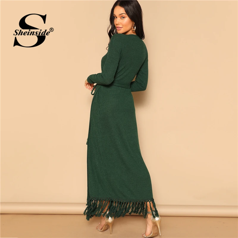 Special Offer Sheinside Green Fringe Hem Rib dzianinowa bluzka ze skośnym dekoltem sukienka z paskiem kobiety długie sukienki imprezowe 2019 V Neck Ladies Casual Dress Discount 40% Today!
