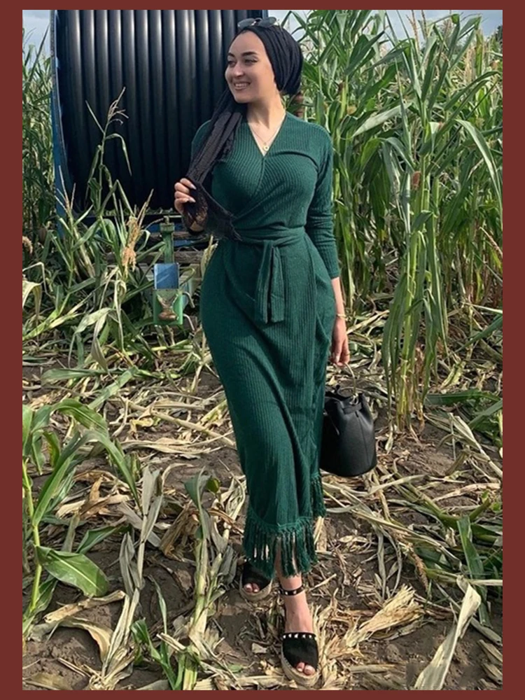 Product Name: Sheinside Green Fringe Hem Rib dzianinowa bluzka ze skośnym dekoltem sukienka z paskiem kobiety długie sukienki imprezowe 2019 V Neck Ladies Casual Dress