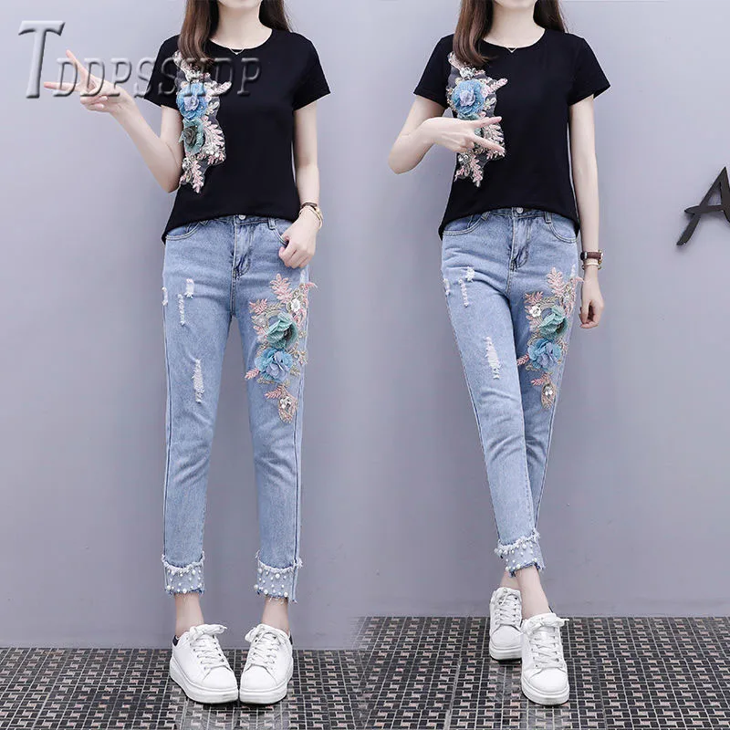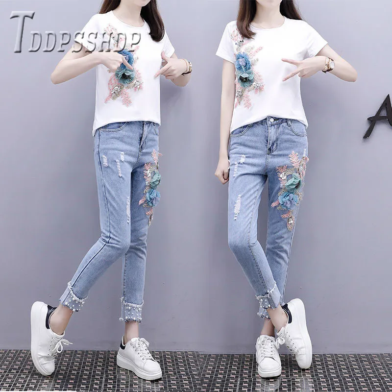 Special Offer 2019 lato frezowanie zestawy dla kobiet T Shirt i dżinsy zestawy damskie Discount 5% Today!