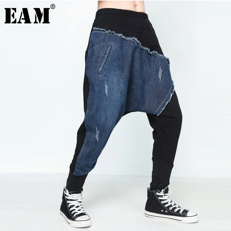 Special Offer [EAM] 2020 wiosna nowy wzór mody osobowości Denim szwy Elatic talii spodnie krzyżowe fala luźne spodnie damskie YC22301 Discount 28% Today!