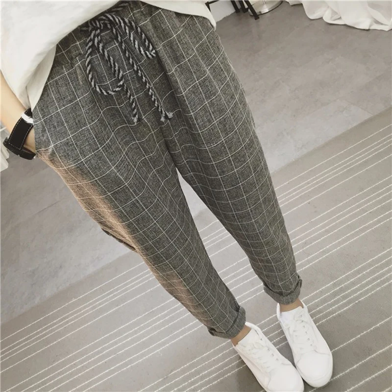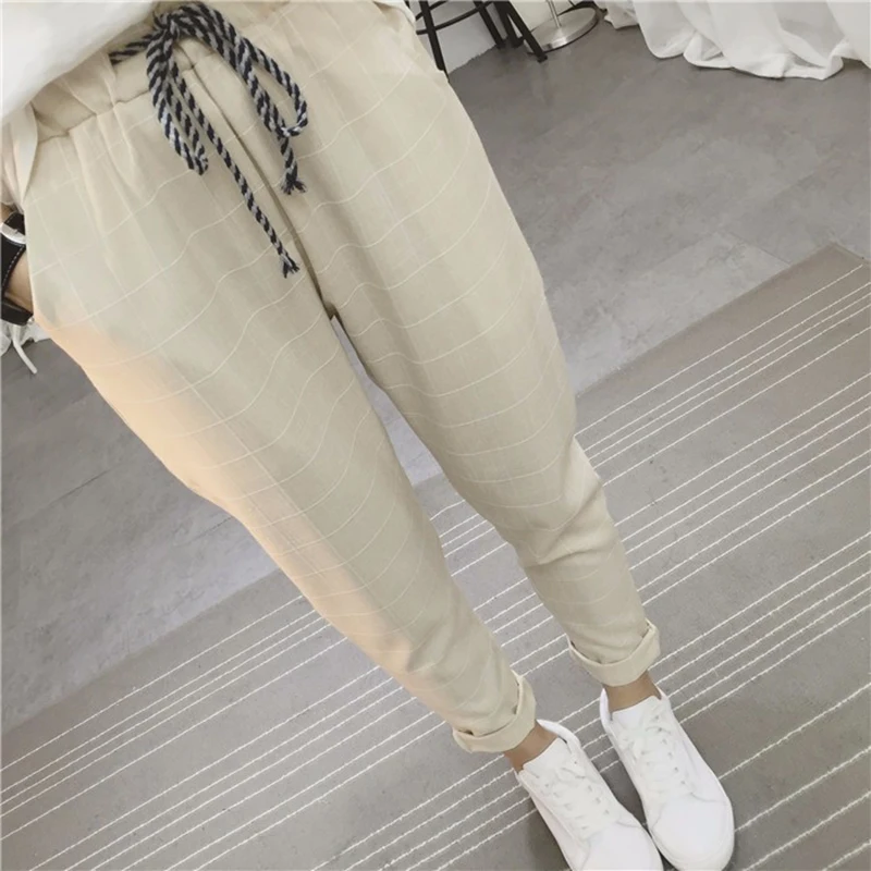 Product Name: Spodnie dla kobiet 2019 nowy letni dorywczo luźne szarawary Cotton Linen Plaid Capris siatka wiosna literackie spodnie Sarouel Femme