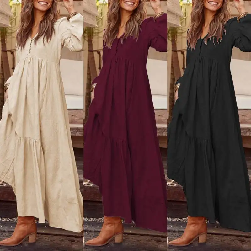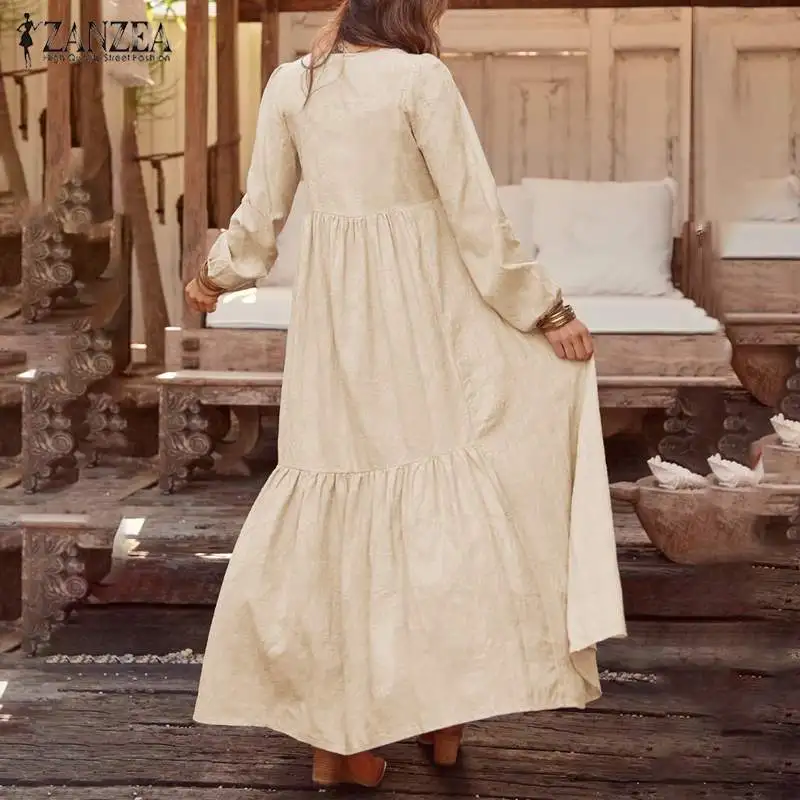 Product Name: ZANZEA Plus Size kobiety na co dzień z długim rękawem plisowana sukienka na imprezę elegancki V Neck kieszenie długi Maxi sukienki moda czeski Vestidos