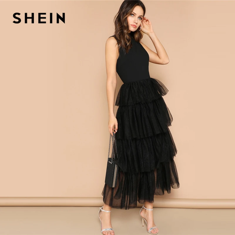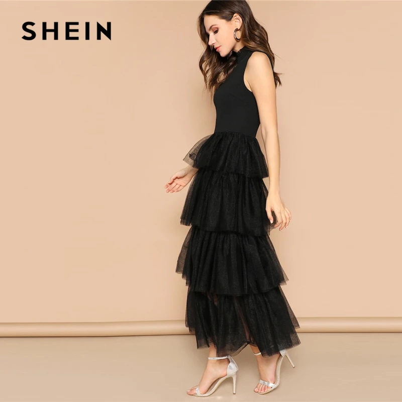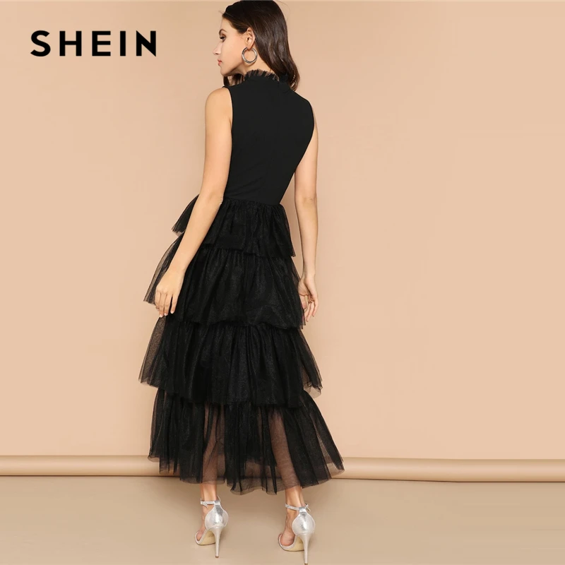 Special Offer SHEIN Glamorous czarne mieszane Media warstwowe kontrastowe siatkowe falbany długie sukienki eleganckie makiety bez rękawów 2019 wiosenne sukienki Discount 45% Today!