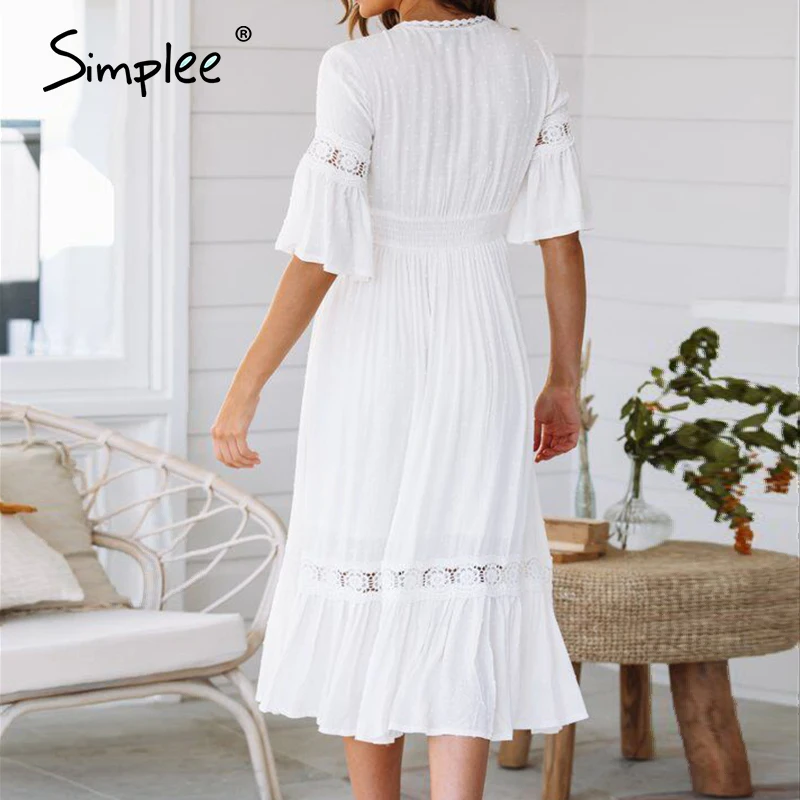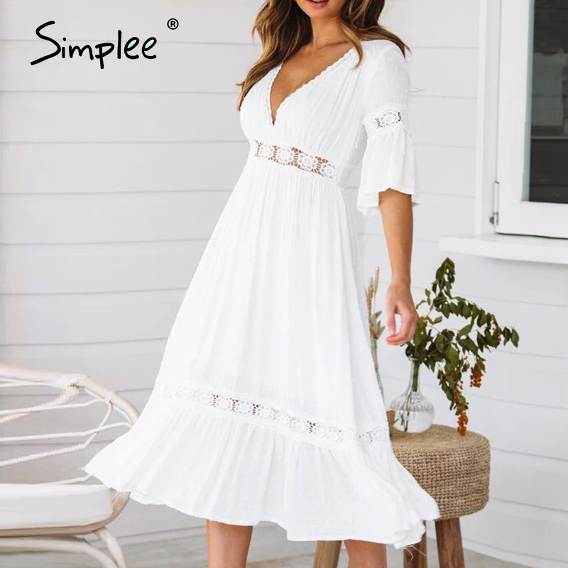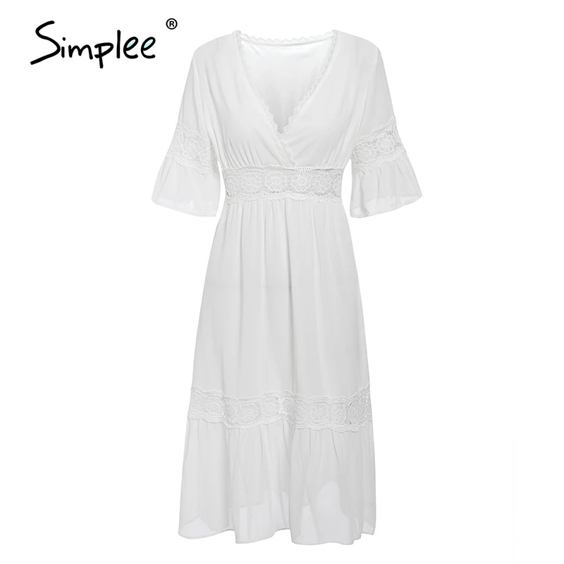Product Name: Simplee Sexy dekolt w serek kobiety biała koronkowa sukienka elegancka hollow wzburzyć wyszywane rękawy sundress styl wakacyjny lady lato maxi sukienka