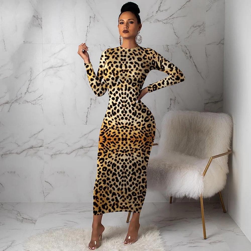 Product Name: Kobiety Leopard z długim rękawem sukienka suknie wieczorowe jesienno zimowa Bodycon długość kostki przylegająca elegancka wysoka talia Plus rozmiar