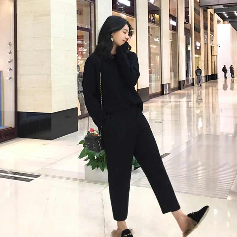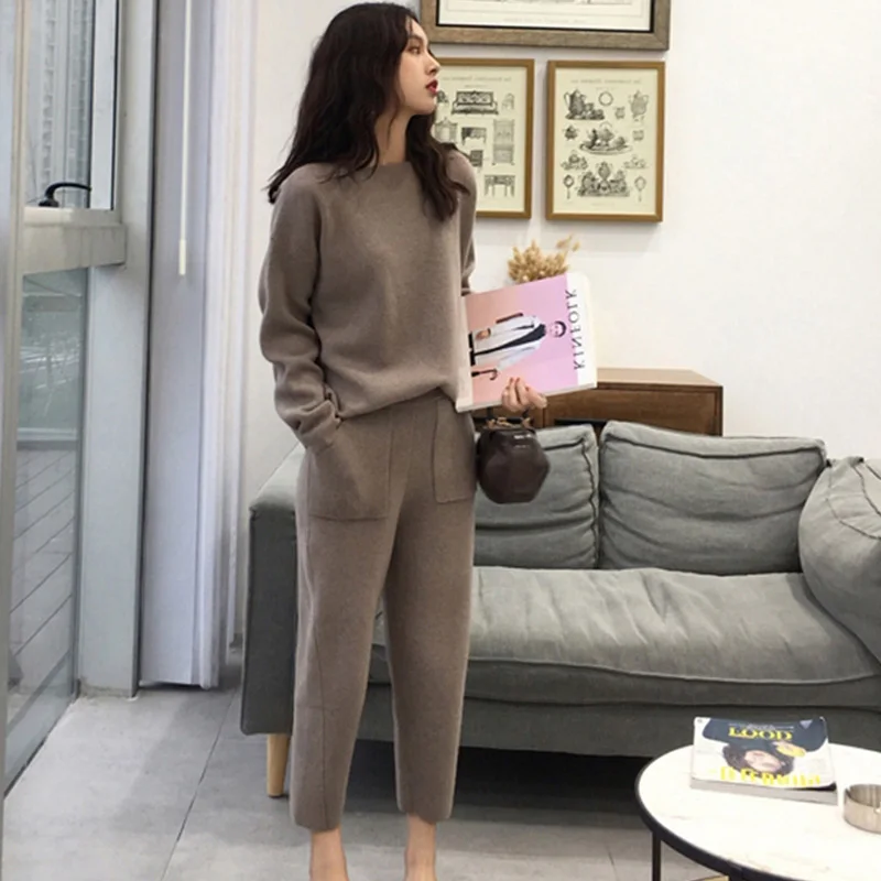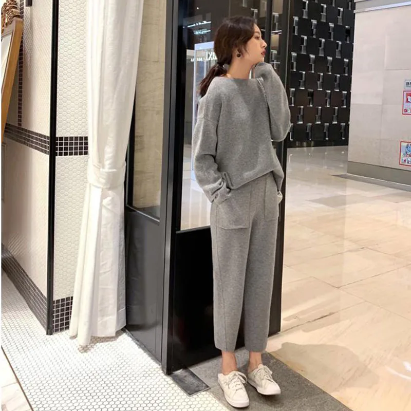 Special Offer Dzianinowy damski dwuczęściowy zestaw swetrów garnitur ze spodniami jesień kostki garnitury sportowe kobieta 2020 moda rękaw w kształcie skrzydła nietoperza 2 częściowe zestawy Discount 50% Today!