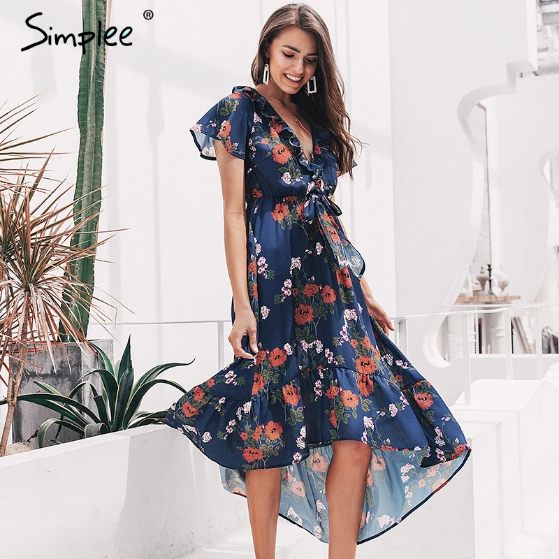 Product Name: Simplee Sexy v neck kobiety asymetryczne sukienki z krótkim rękawem, kwiatowy print długi plus rozmiar sukienka lato elegancki wakacje vestidos 2019