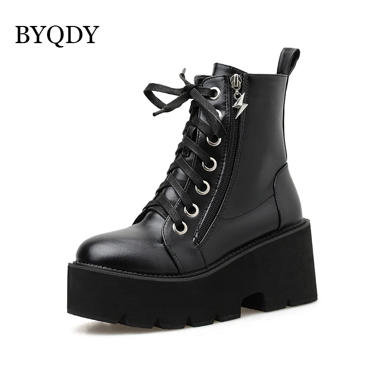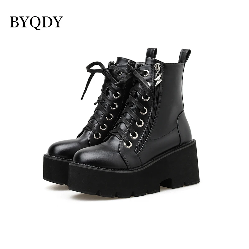 Product Name: BYQDY wiosna jesień kobiety buty czarne kliny obcasy buty gotyckie sznurowanie platformy botki Chunky Heel obuwie damskie rabat