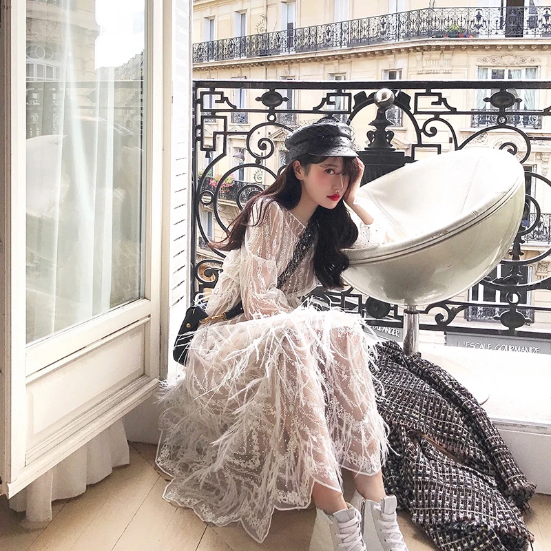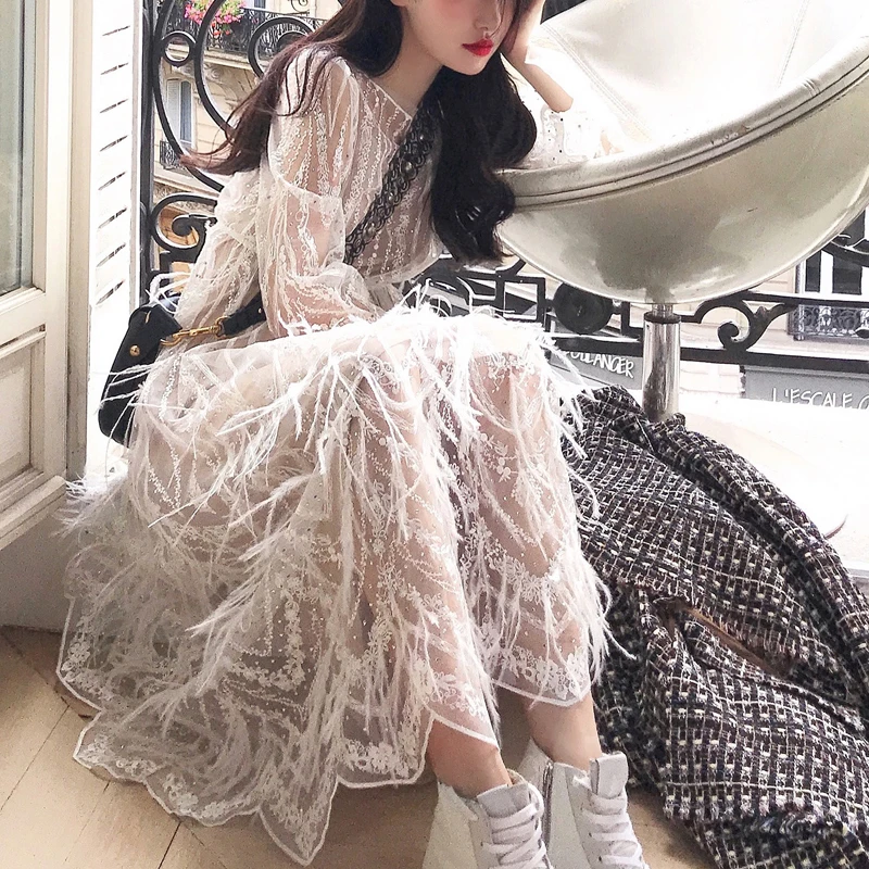 Product Name: Kobiety ubierają nowe mody wiosna lato wysokiej klasy eleganckie frędzle pióra sexy formalne party biały pas startowy z długim rękawem strój koronkowy