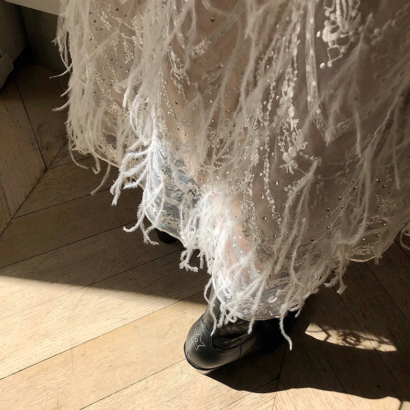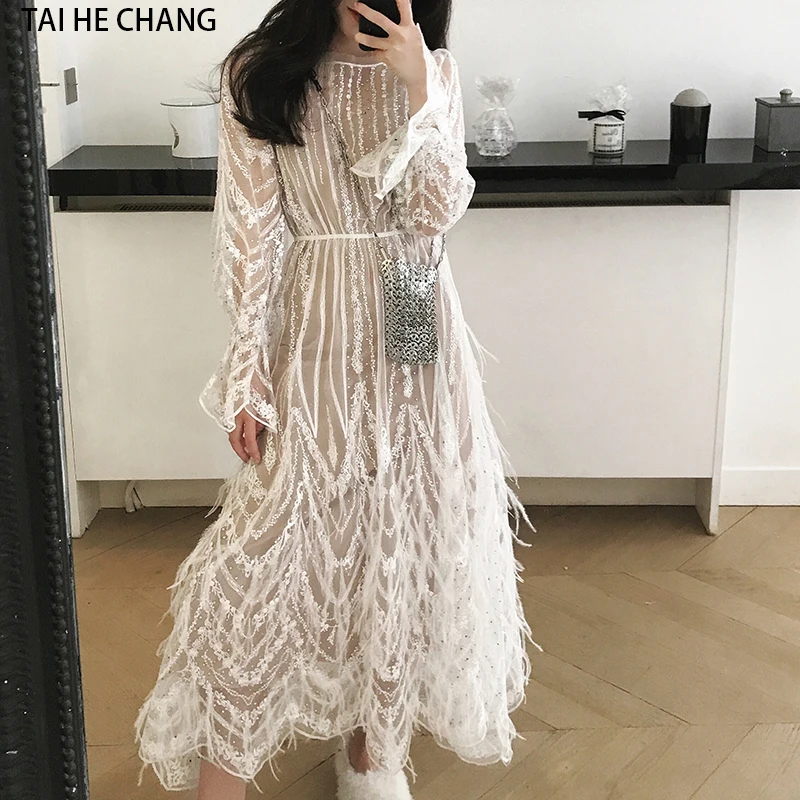Special Offer Kobiety ubierają nowe mody wiosna lato wysokiej klasy eleganckie frędzle pióra sexy formalne party biały pas startowy z długim rękawem strój koronkowy Discount 25% Today!