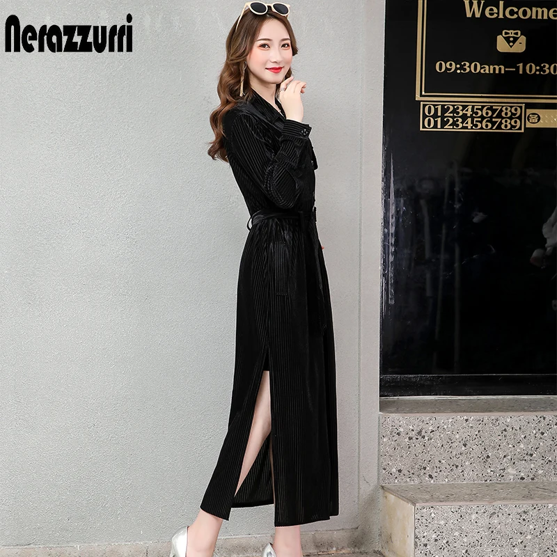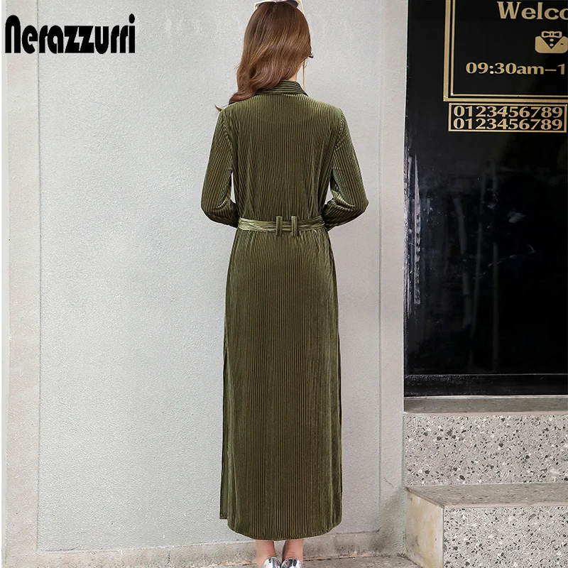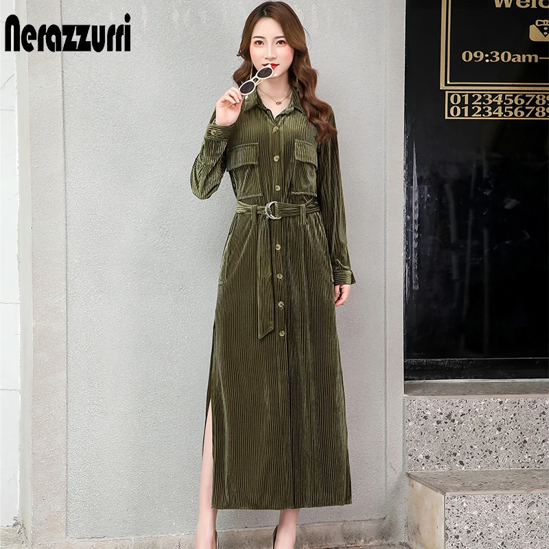 Product Name: Nerazzurri długi, aksamitny strój damski z długim rękawem z paskiem zapinana na guziki w paski koszula w dużym rozmiarze sukienka 2019 jesień ciepły runway plus rozmiar sukienka