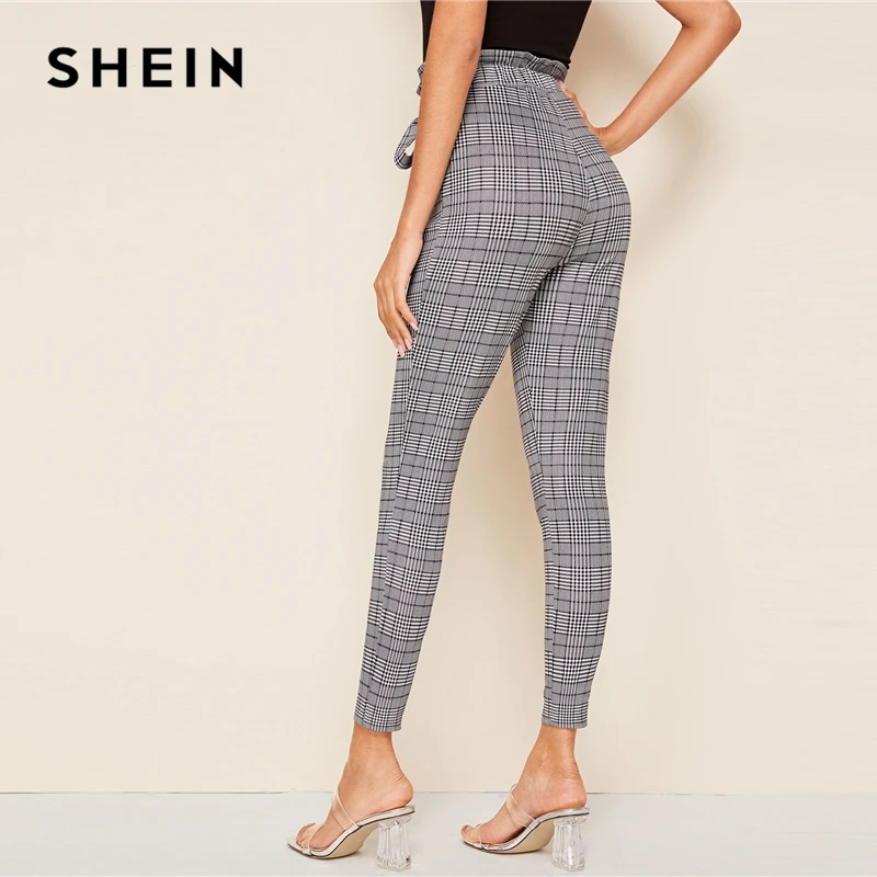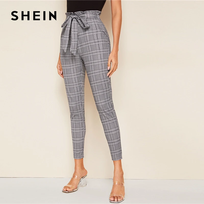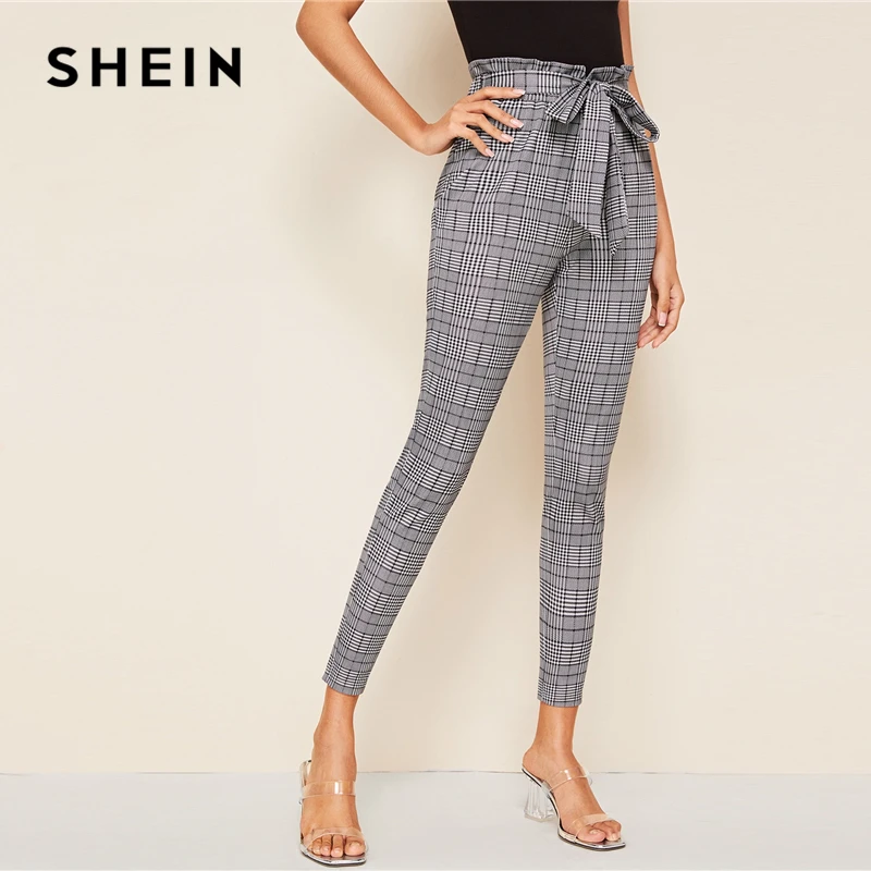 Special Offer SHEIN szary Plaid papierowe talii z własnym paskiem na co dzień spodnie damskie spodnie i spódnice 2019 jesień wysokiej talii biuro panie spodnie skinny fit Discount 45% Today!